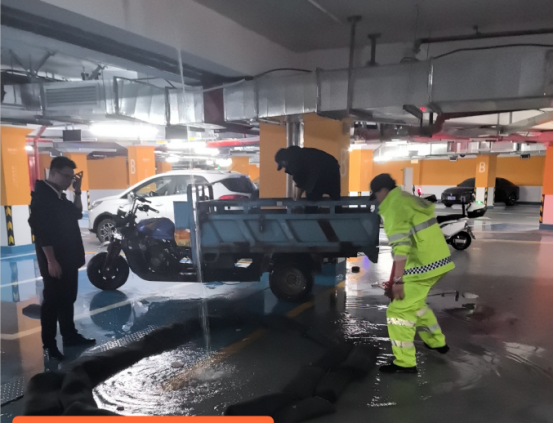 同时,第二处置组检查电路设备、进行地库地漏的疏通并启动排污泵。