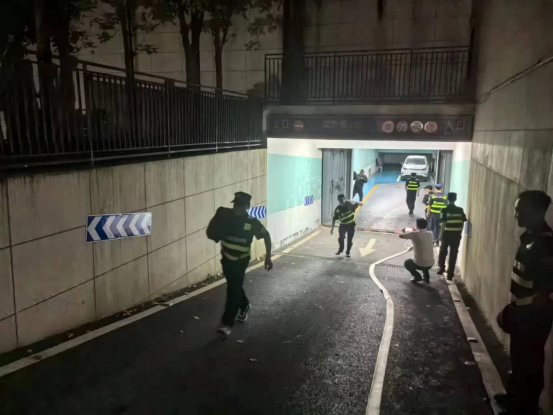 本次演练由项目负责人吴队长提前做好应急演练预案并组织实施。现场模拟因强降雨导致小区地下停车场积水,接到指令后保安队员们迅速启动应急预案,各处置小组迅速进入现场按预案流程进行处置。