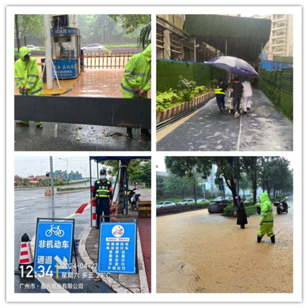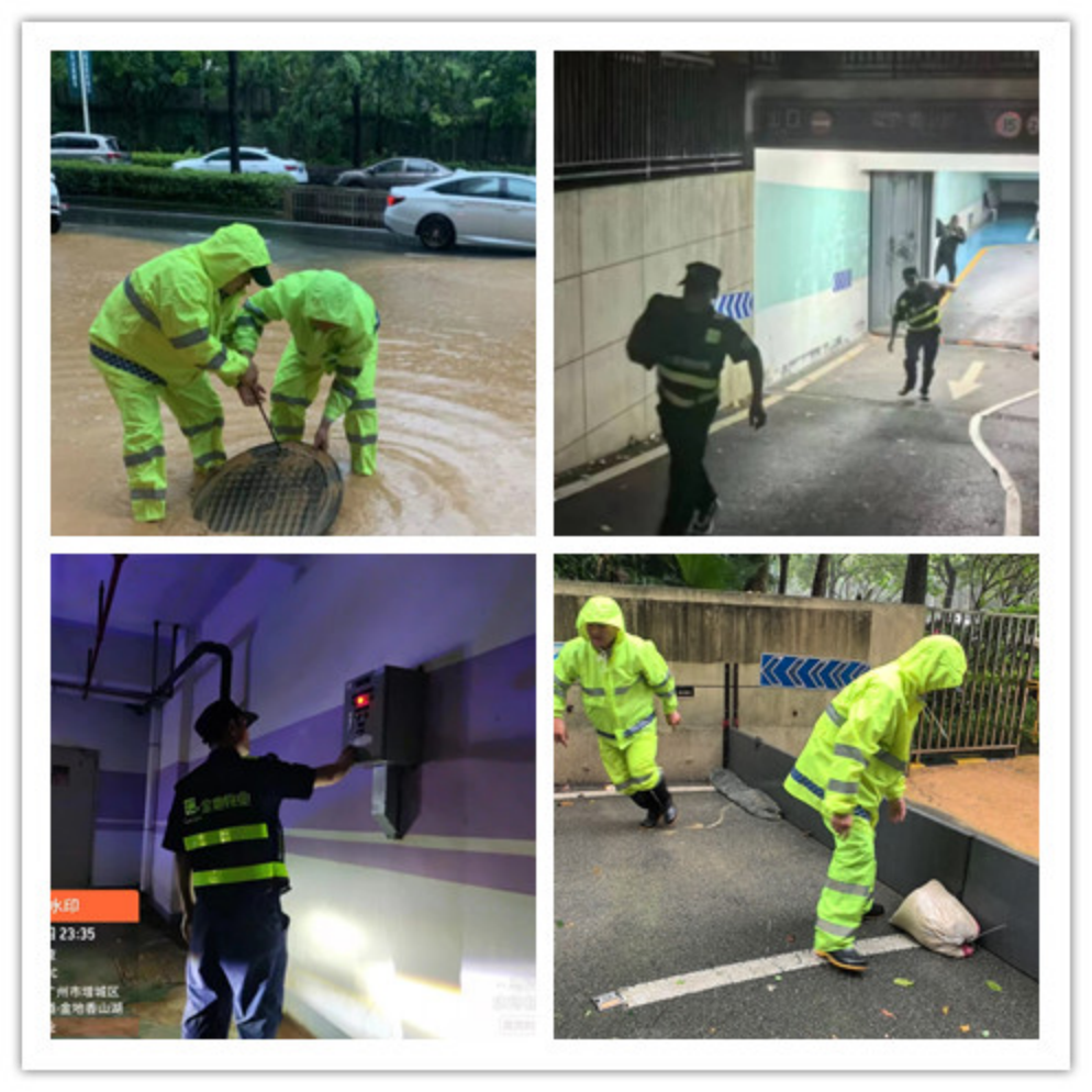 国荣保安积极应对暴雨极端天气对服务项目可能造成的安全隐患,加大对物业小区的地下车库防涝措施、高层和超高层建筑防风防坠措施;及时处理可能因暴雨、大风造成区内树木的断枝、倒伏等问题;加大对地下车库巡查力度,针对历年易涝、积水等点位进行重点巡查。同时,提前做好防汛物资准备,动态掌握辖内物业小区实时情况,加强对排水口等进行清疏,靠前调度处理突发情况,确保排涝系统正常运行,为人民群众的安全出行提供有力保障。
